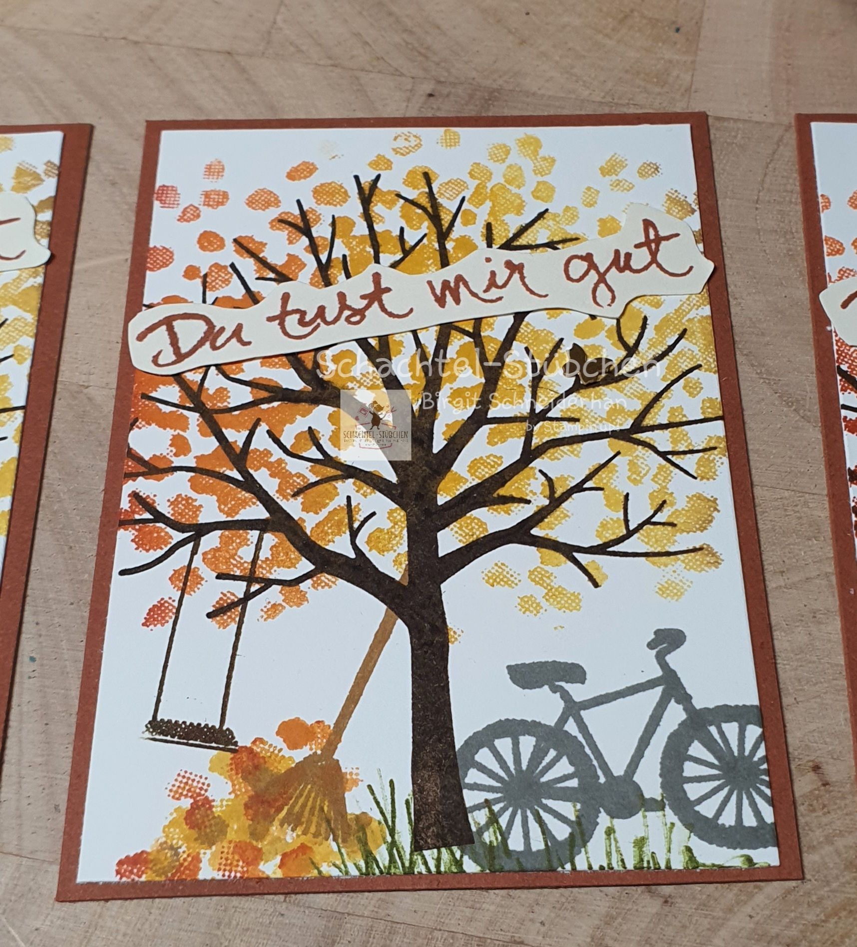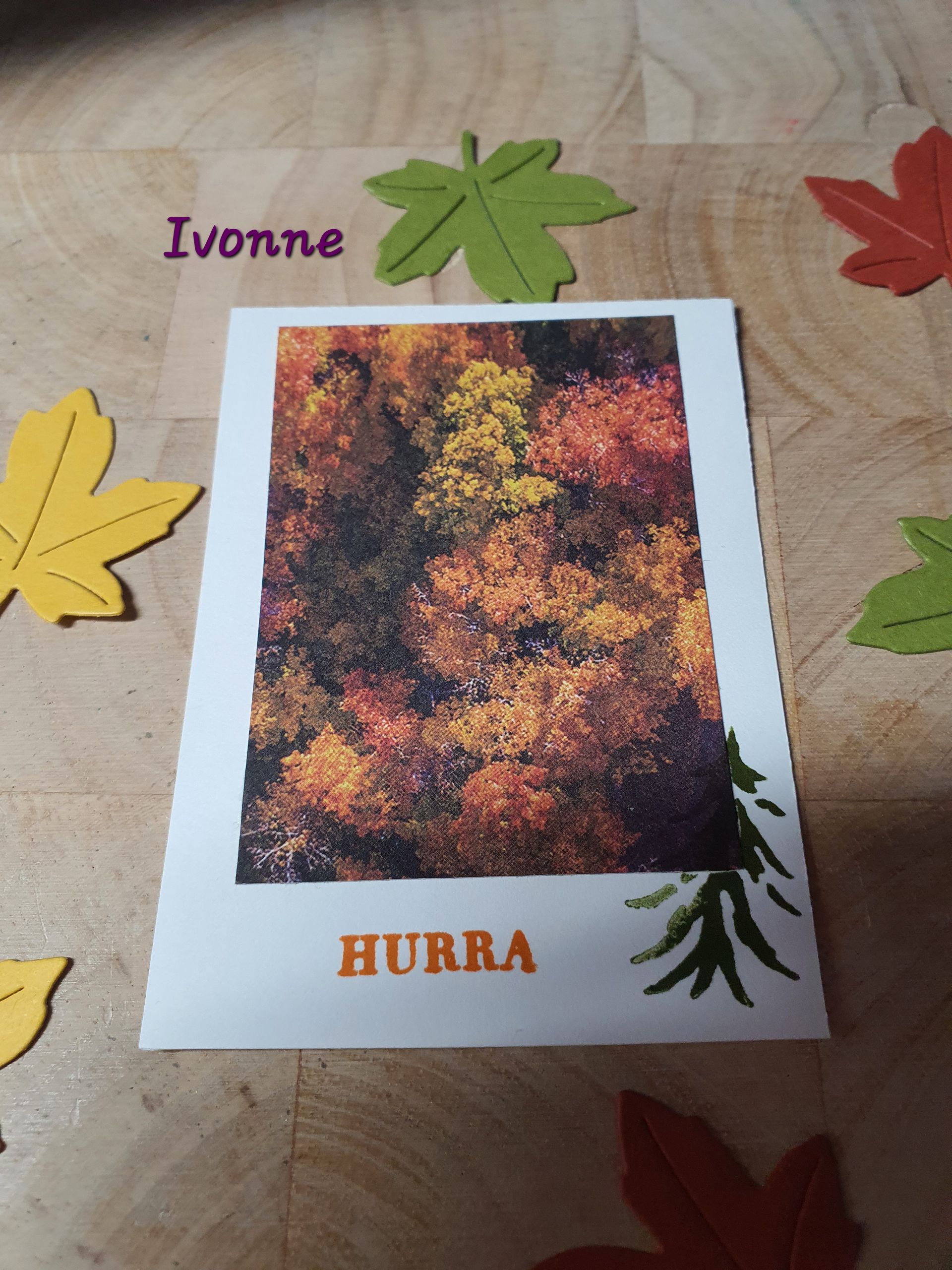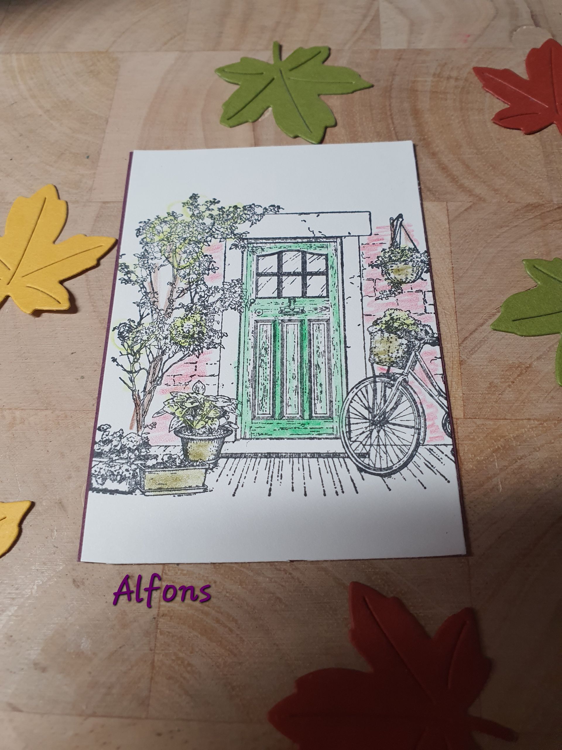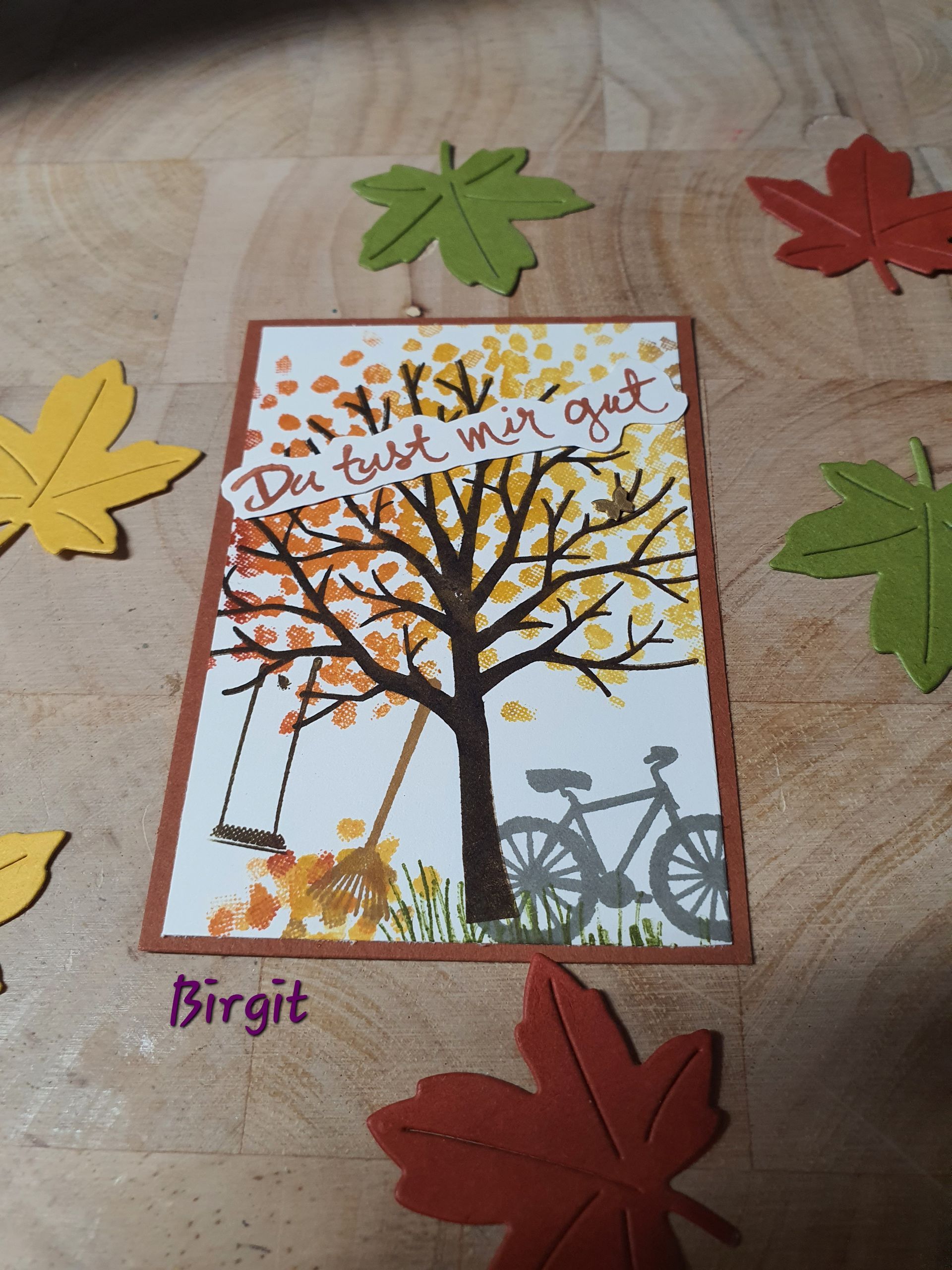 Zum Haus von meinem Großvater, in dem ich "groß" werden durfte, gab es einen Garten. Dort stand ein alter, knochiger, dickstämmiger Apfelbaum. Die Äpfel waren lecker und wir hatten zeitweise sogar ein Baumhaus darinnen. Natürlich nur für die Jungs, wir Mädels hatten da nichts zu suchen. Jedoch haben wir immer alle mit angepackt, das Laub im Herbst zusammen zu rechen; wenn auch mit "leichtem" Murren. Deshalb der Laubhaufen unterm Baum auf meiner Karte und der Besen - okay kein Rechen - stand dort auch immer. Eine Schaukel hätten die Äste nicht mehr getragen, aber eine Schaukel stand direkt neben dem Garten in der Auffahrt zur Garage. Dafür mit Seil und Schifferschaukel. Die Fahrräder waren auch nie im Garten, aber der Garten war wunderbar. Danke, dass wir an einem so schönen Ort "groß" werden durften.
